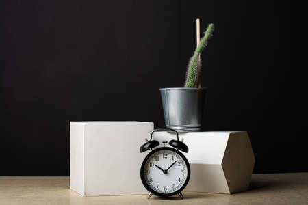 A clock against the background of two plaster figures and a cactus standing on a prism.