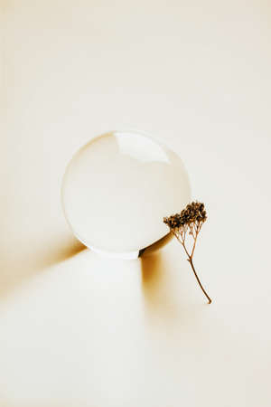 Universal concept with glass crystal ball with tender dry wood. Neat abstract background for text adding