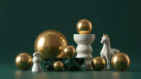 3d render of white and golden easter eggs with horses on green background