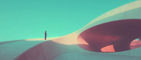 A striking image showcasing a minimalist concrete structure with geometric shapes, set against a clear blue sky, highlighting modern architectural principles.