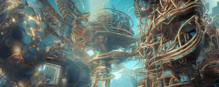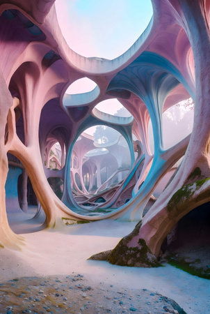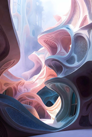 Digital fine art work with abstract another civilizations or four dimension concept. pastel colors. AI generated