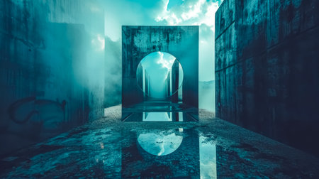 A science fiction graphic design concept of a glowing portal. With a mysterious figure mirrored in a misty spooky landscape at night.