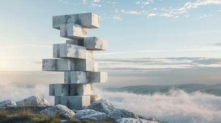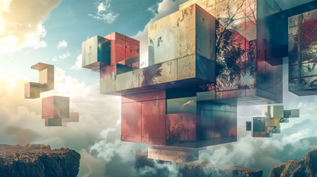Abstract concrete cubes floating in the sky above mountains