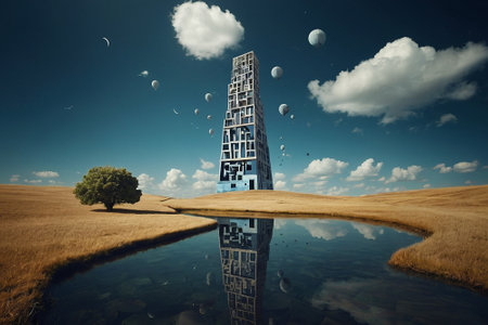 Conceptual image of modern skyscraper with reflection in water.