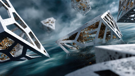 A captivating abstract 3D rendering showcasing geometric shapes that appear to float in a surreal atmosphere, enhanced by a striking metallic texture.