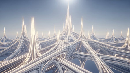 A complex, ethereal network of sharp white spires and organic branching structures under bright light.