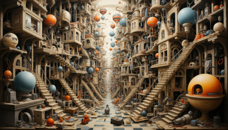 Playful sci fi city made of stacked houses with many stairs and balconies. Colorful spheres float in the air like balloons. Detailed whimsical architecture fills the long corridor.