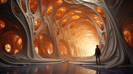 A person standing in a colorful room with an abstract background, AI