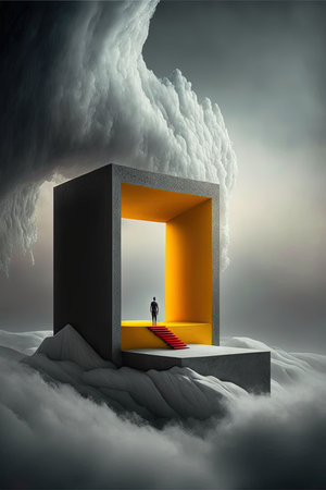An AI generated illustration of person standing in a small yellow cube above dark cloud filled sky