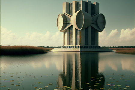 An AI generated illustration of a big building on the shore in the middle of the river