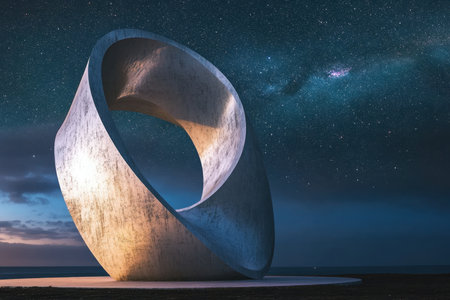 A striking modern sculpture sits against a clear night sky filled with stars, showcasing a unique design.