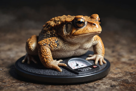 A whimsical juxtaposition of wildlife and measurement, featuring a frog perched quietly on a scale.