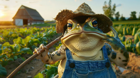 A determined frog dressed as a farmer in overalls and a straw hat, holding a pitchfork in a vibrant crop field with a barn in the background.