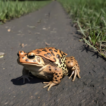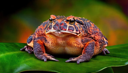 A richly textured frog sits on a damp surface, showcasing its distinctive features surrounded by greenery. The scene captures the beauty of wildlife in a serene environment.