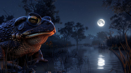 large frog sits by a tranquil pond, gazing at the full moon illuminating the water. The frogs eyes gleam with a mysterious light, reflecting the ethereal beauty of the night.