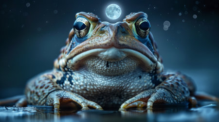 toad sits patiently on a smooth surface, its large eyes gazing directly at the viewer under a full moon.