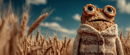 A charming character with bread like features and large eyes stands amidst tall golden wheat under a blue sky.