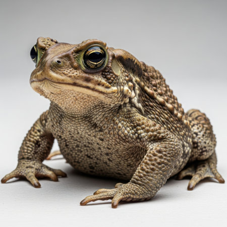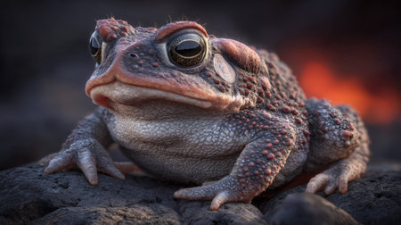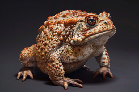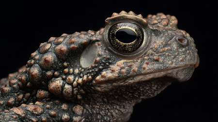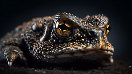 A detailed image showcases a toad with rough skin and a textured appearance. The amphibian is depicted with prominent eyes and a focused gaze. The lighting creates a dynamic play of shadow and highlights, enhancing the depth and detail of the subject, suggesting potential use in scientific, educational, or illustrative contexts.