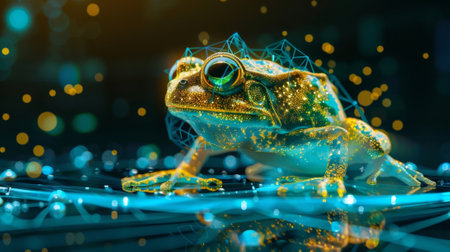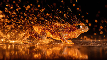 An amphibian is depicted in mid-action, engulfed in golden particles against a dark backdrop. The image features a shallow depth of field, highlighting the frog's textures and movement. Warm lighting creates a sense of dynamism. This image is suitable for various commercial uses, including advertising and editorial content.