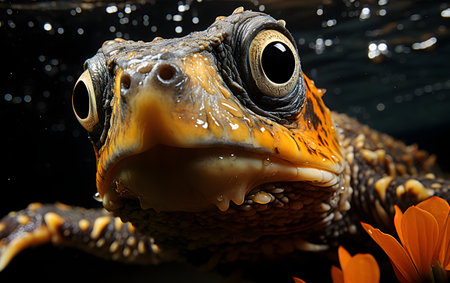 close up of a frog head on a black background with orange flowers