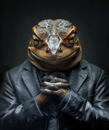 Evil toad with hands clasped in a business suit against a dark background, depicting social satire