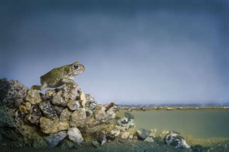 A close-up image of a green frog sitting among rocks and soil. The frog has a warty skin texture and is looking directly at the camera with its large, dark eyes. The background consists of various sizes of rocks and some patches of green moss.