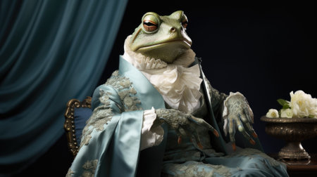 A frog dressed in a formal outfit sits on a chair. Generative AI image.