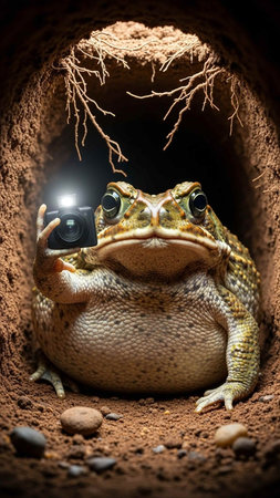 A large frog sitting in a cave holding a camera