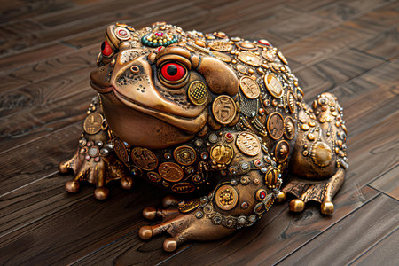 Chinese golden toad made of gold among treasures and golden coins