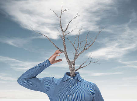 Headless man with a dead tree instead of head . Confusion and doubt concept . This is a 3d render illustration .