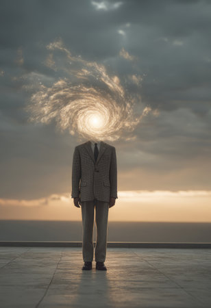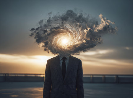 Surreal image of a businessman with a swirling galaxy and clouds substituting his head, symbolizing imagination, innovation, and vast potential