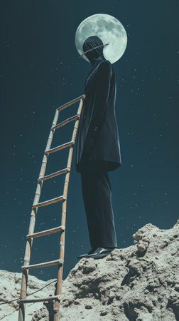 surreal photo of a single man in a suit on a staircase with balloons in a field