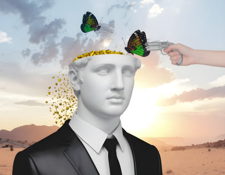 Surreal scene of a businessman in a suit with his head exploding into particles, symbolizing a mind-blown moment.