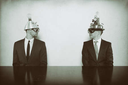 Workaholic man with a funnel head and business suit, overwhelmed by overthinking, working and information, burnout and stress, mental health, illustration