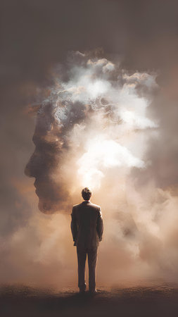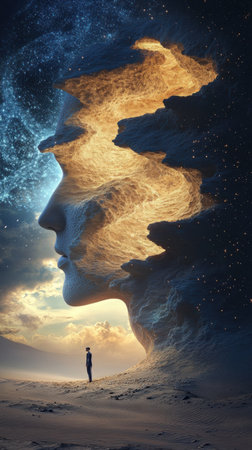 A visually stunning artwork depicting a person standing before a womans face dissolving into clouds, symbolizing introspection and the power of the mind.