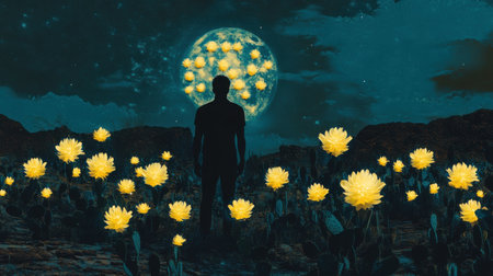 Against a starry sky, a man's silhouette stands in a desert filled with vibrant yellow flowers, illuminated by a large, glowing moon. The scene evokes a sense of wonder and tranquility at night.