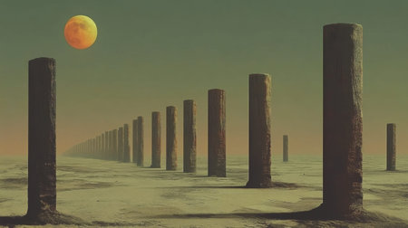 A surreal landscape featuring tall, solitary columns stretching into the distance under a dramatic sky with a striking celestial body, evoking feelings of calm and wonder.