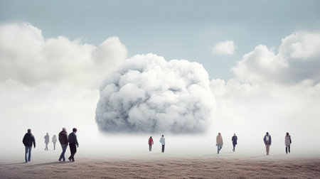 silhouette of a group of people walking in the fog.