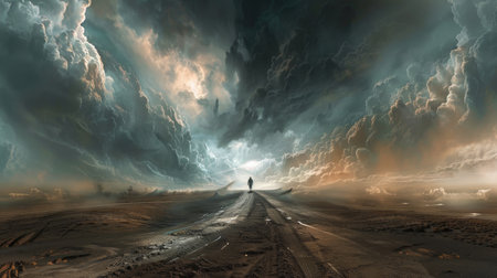 A panoramic view of a lone figure standing at a crossroads in a vast, open landscape under a dramatic sky, symbolizing a pivotal moment of decision and the unknown paths that lie ahead.