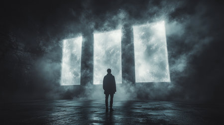 Silhouette of person facing large illuminated screens in the misty atmosphere, futuristic concept