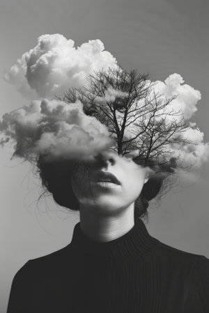 Surreal collage. Vintage poster style photography. Young woman with tree and clouds in her head. Black and white photos.