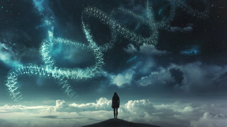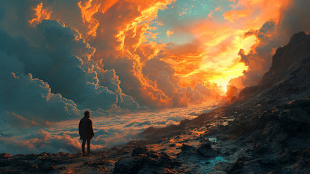 A lone individual stands mesmerized, saluting enigmatic clouds that drift in a dusky sky at twilight.