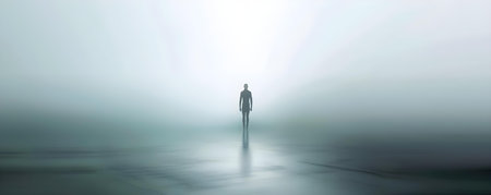 A lone silhouette strides across a hazy terrain as dawn breaks, chasing a luminous horizon that promises new beginnings amid tranquil, mysterious mist.