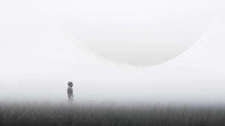 Fantasy landscape with a man in a gas mask against the backdrop of a huge chimney. 3d rendering