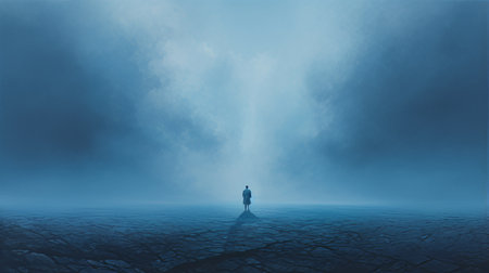 a person walks through a dark, ethereal landscape, surrounded by sky-blue and azure hues. this faith-inspired art captures the enigmatic beauty of desolate landscapes made of mist. the 8k resolution enhances the intricate details, bringing the viewer into a mysterious world of wandering characters. ai generated