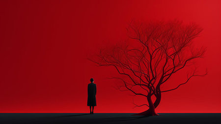 A man in a dark coat stands alone gazing up as vivid red leaves spiral downward from a cloudless dark sky creating a mesmerizing sight.