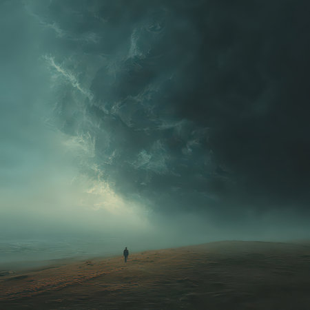 A solitary figure walks along a serene beach, surrounded by dramatic dark clouds that contrast with the calm ocean. The scene evokes a sense of mystery and solitude.