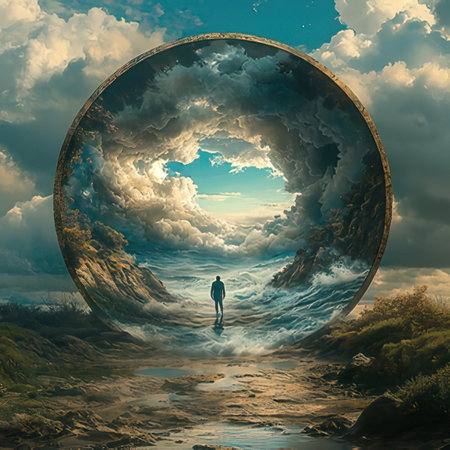 An intriguing image featuring a circular structure that frames a distant landscape, creating a sense of wonder and mystery.