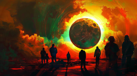 Silhouetted figures under a solar eclipse in a vibrant sky. Shadowed individuals beneath a sun and moon event. Concept of celestial phenomena, cosmic events, silhouette art, vibrant design.