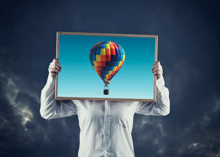 Artist holding an picture with hot air balloons flying, on a dramatic sky in background. The concept of fulfilling desires and dreams.